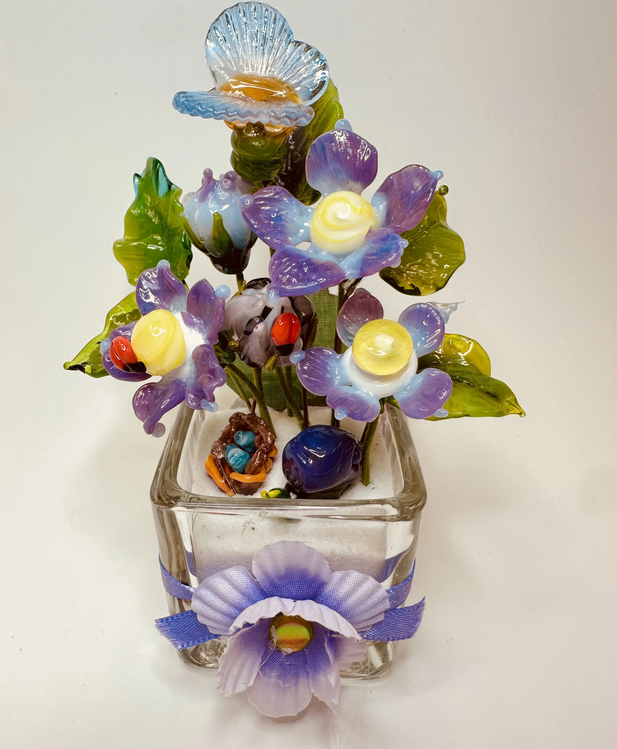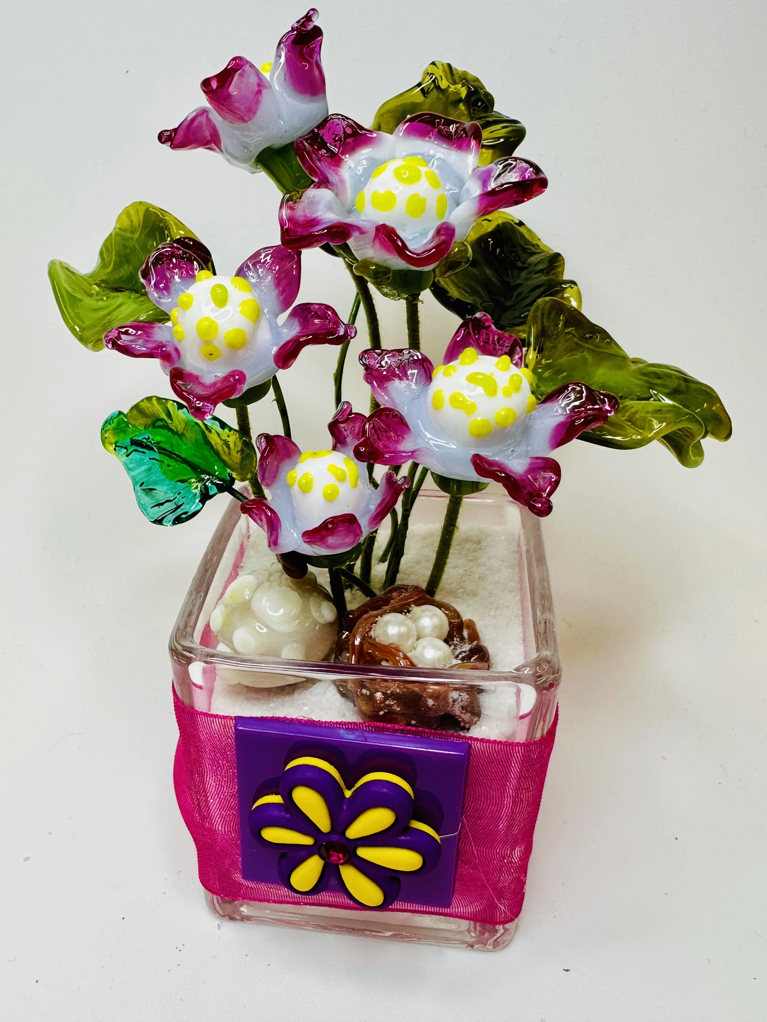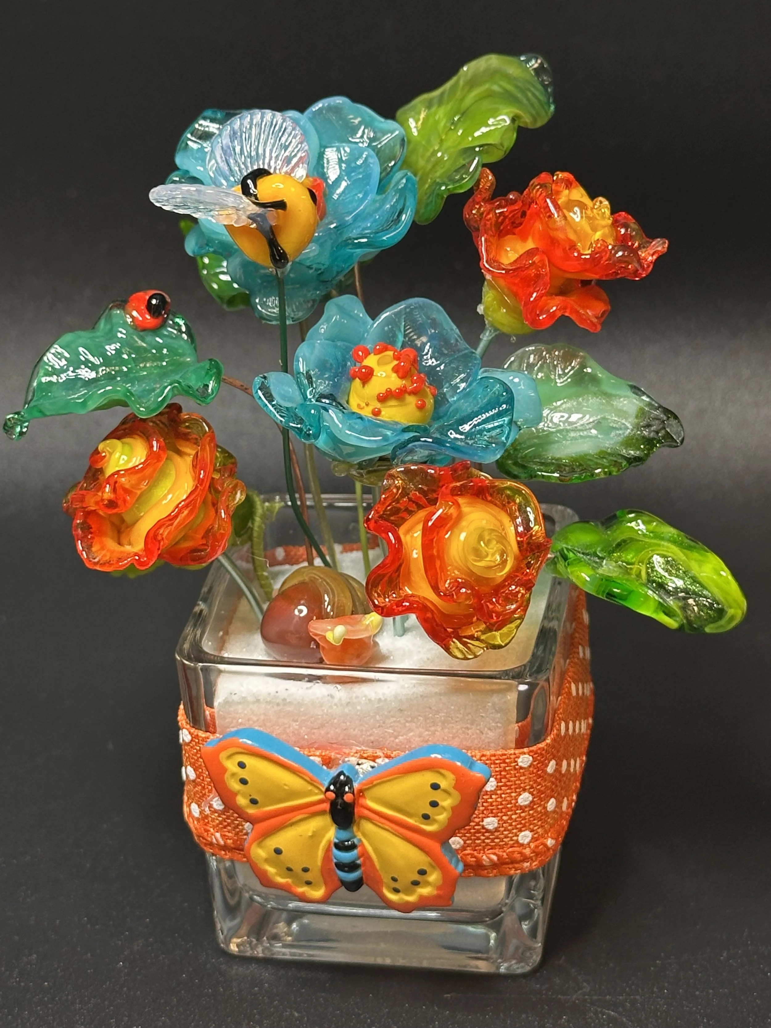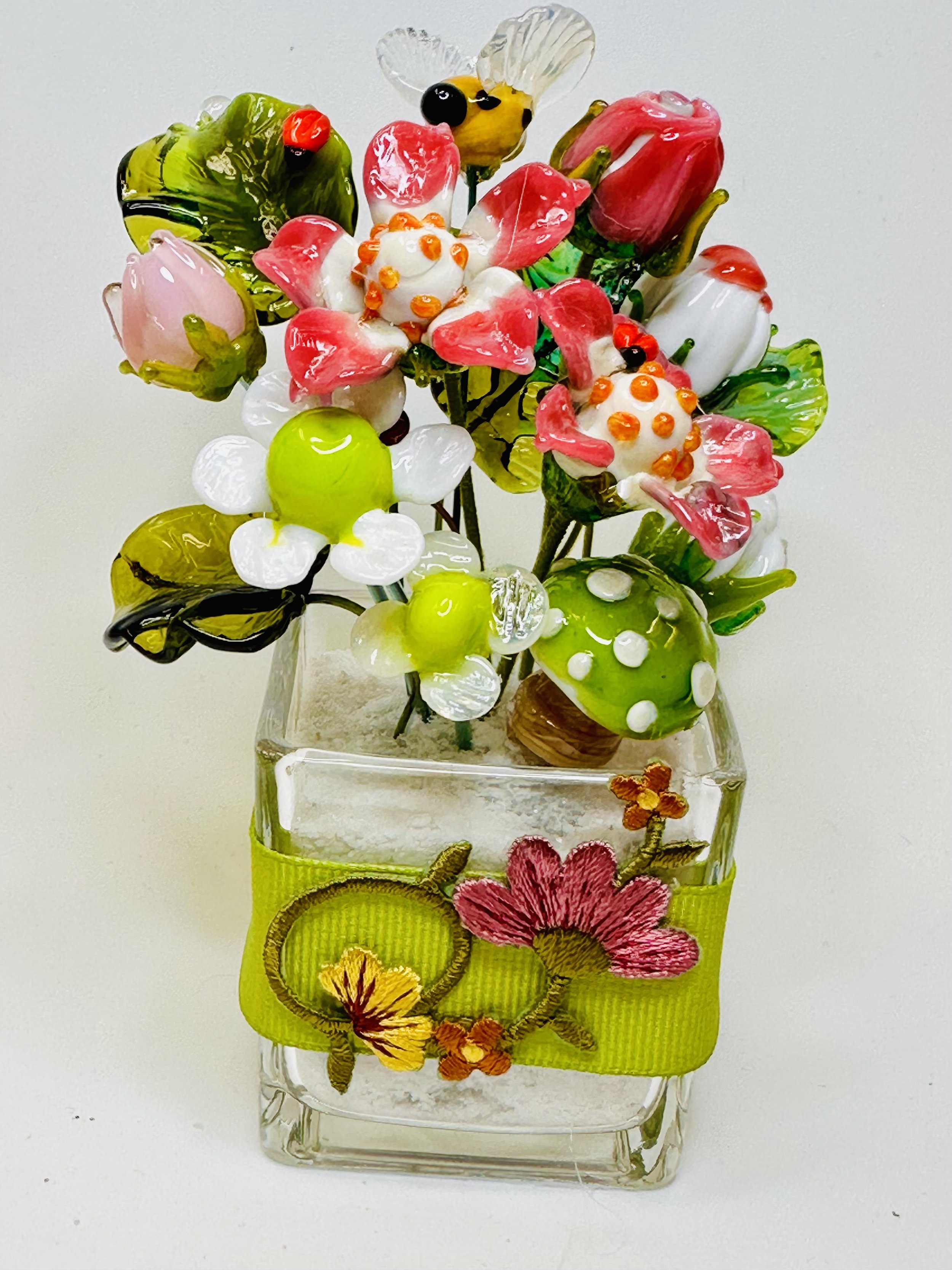 Lampwork flower arrangements each handmade on a mandrel with molten glass.