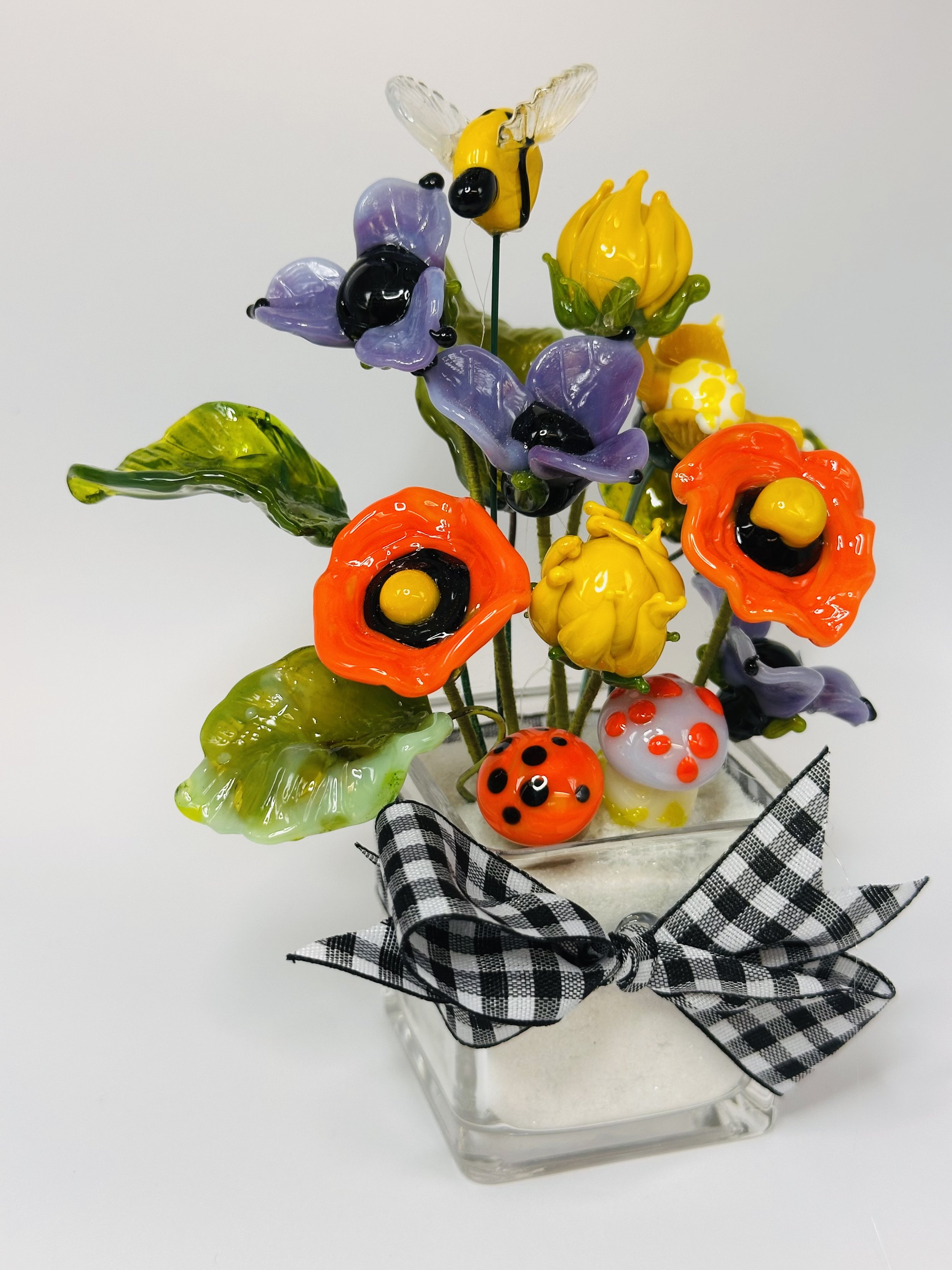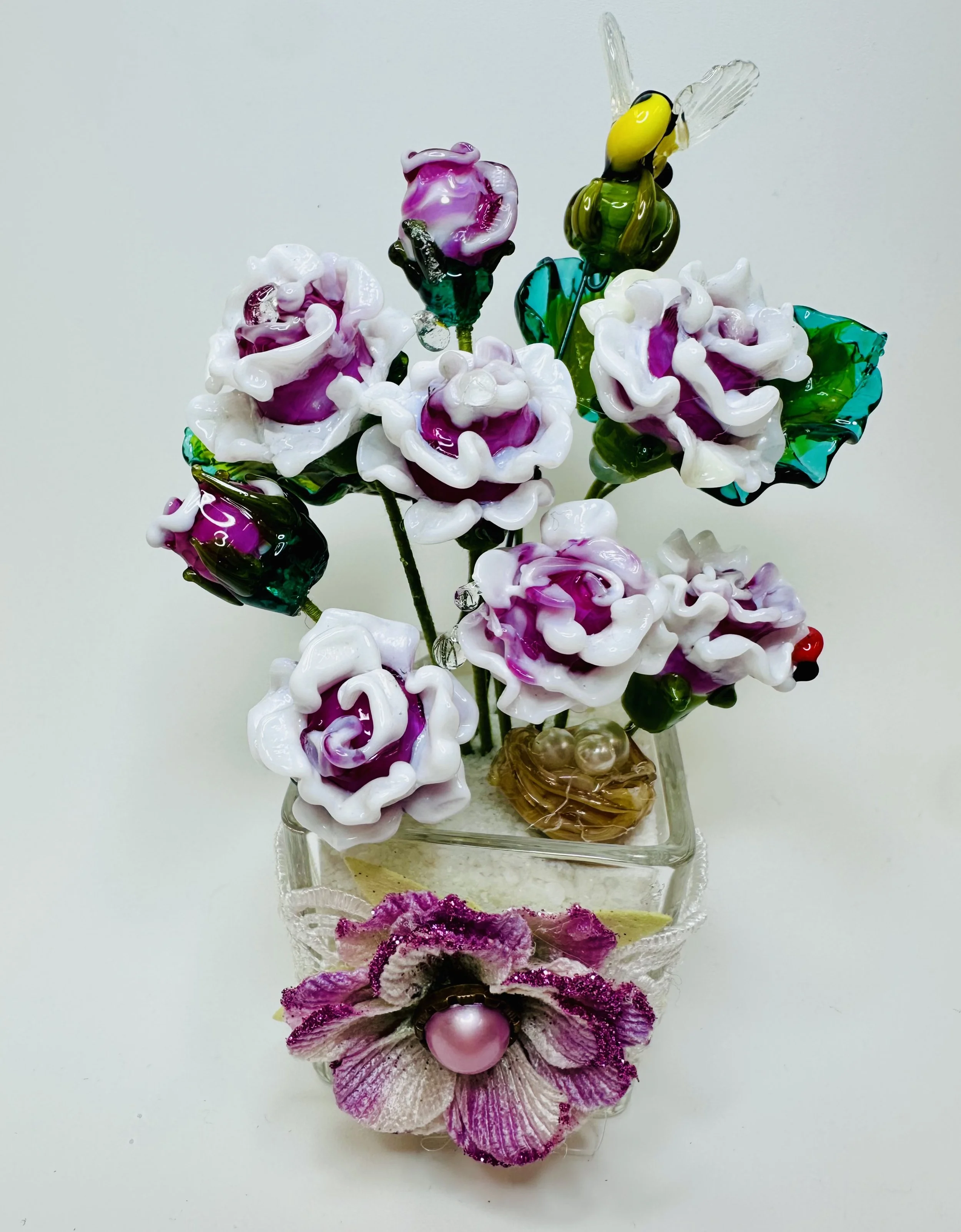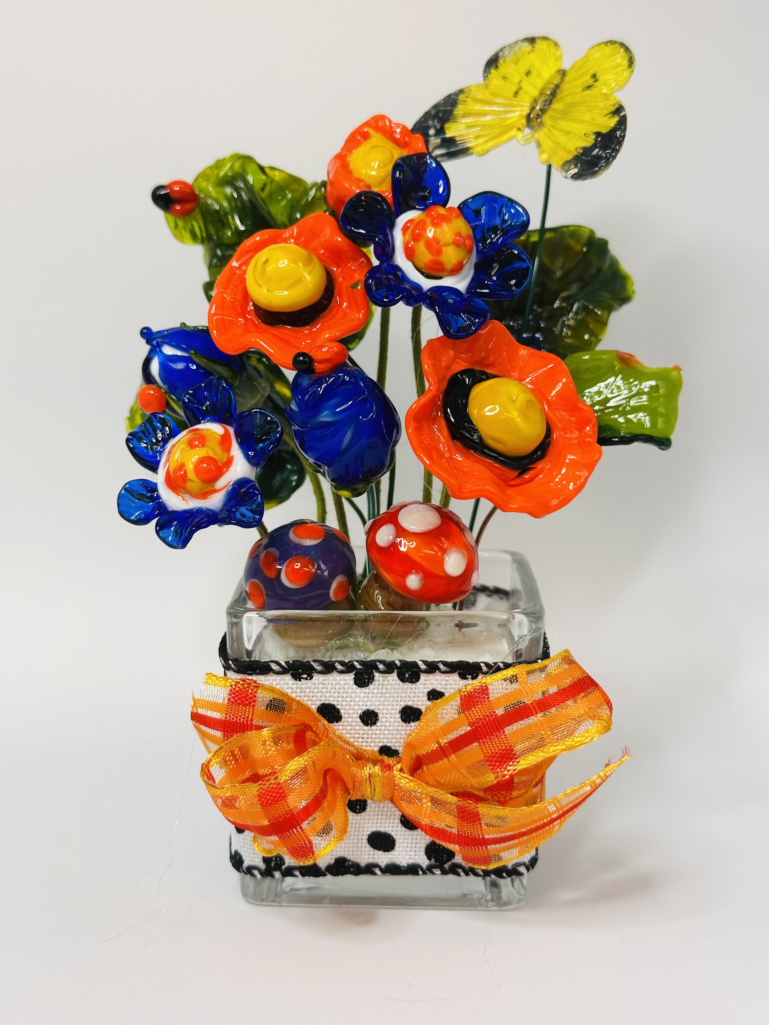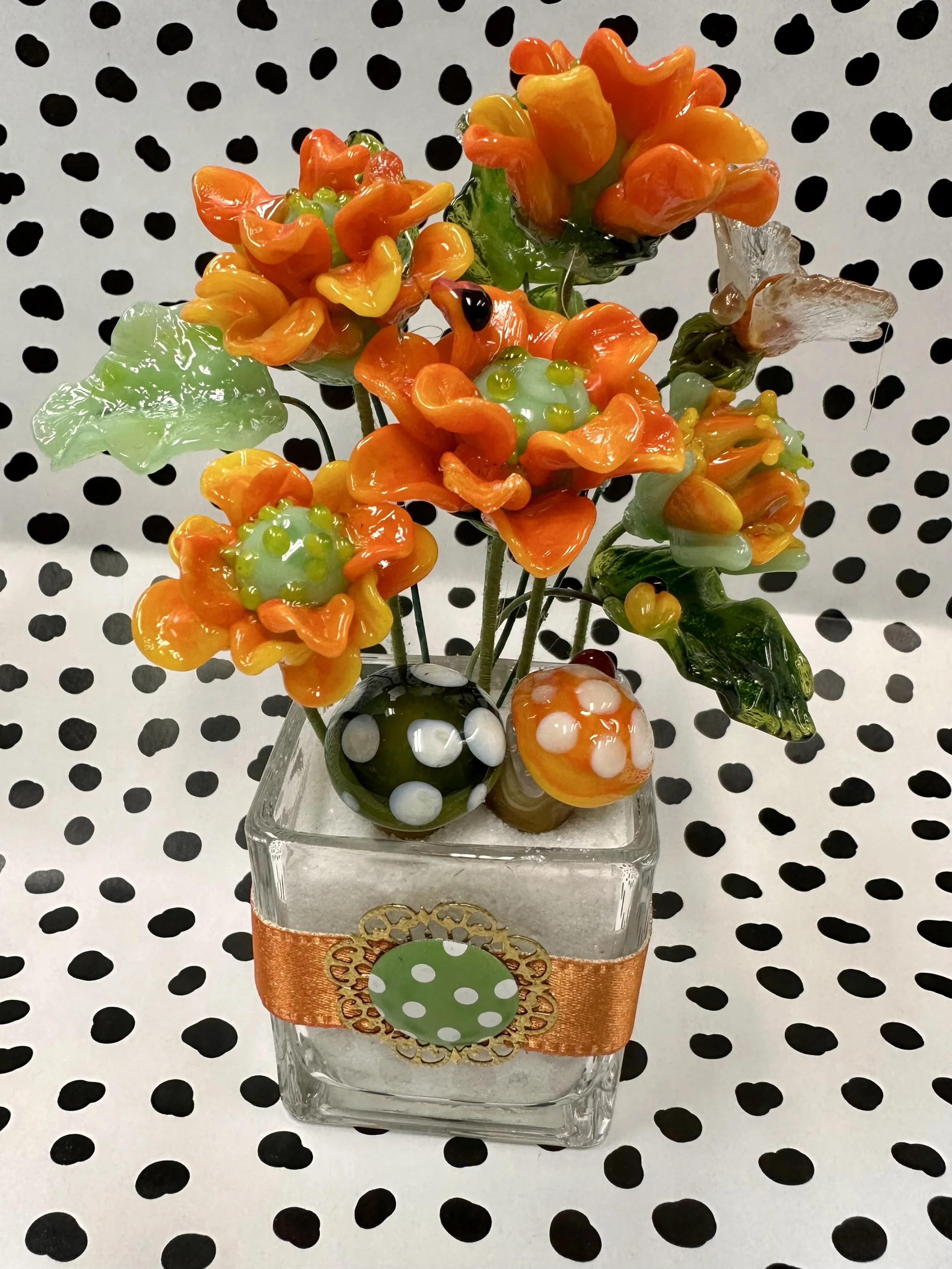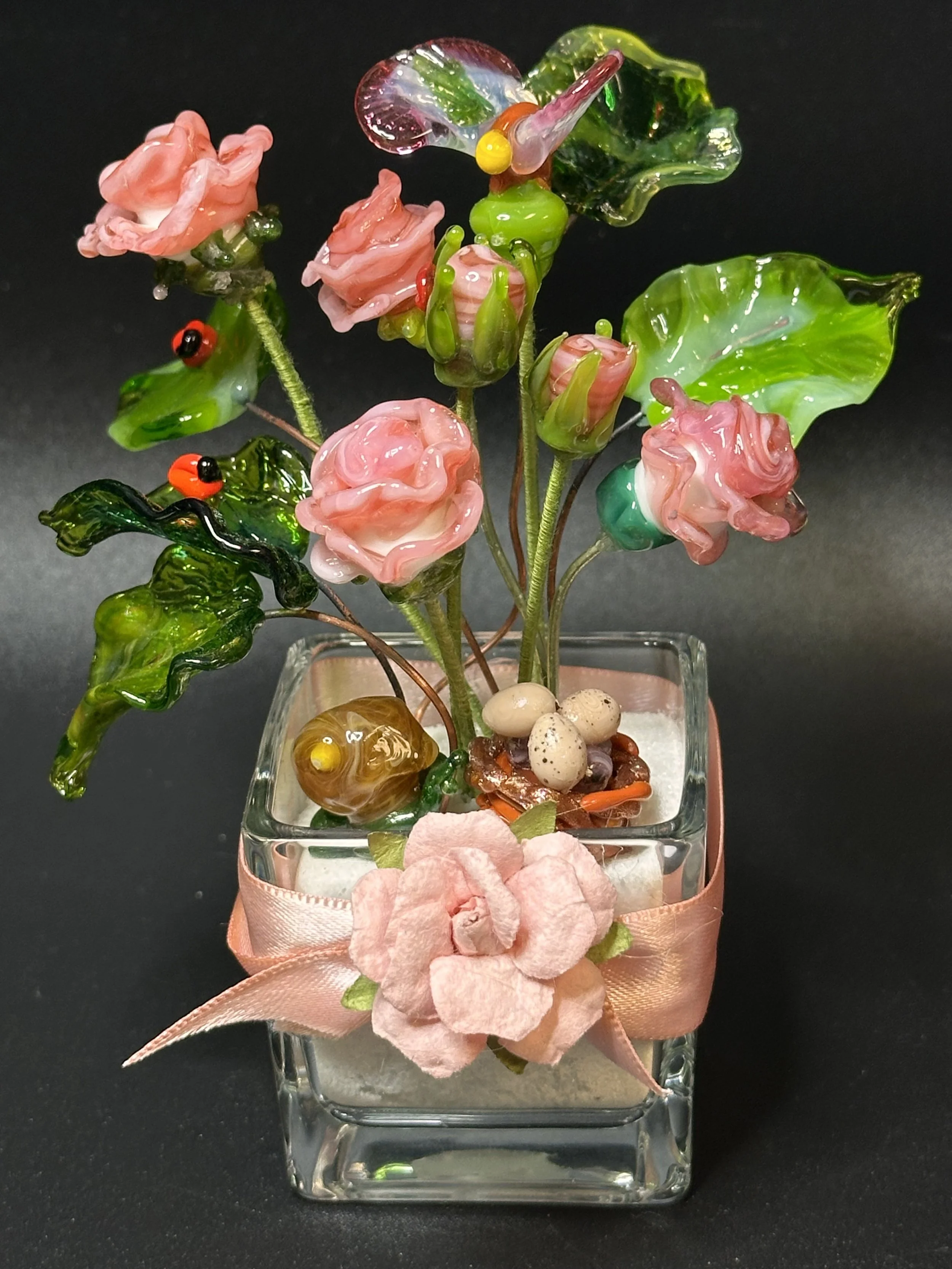 Lampwork flower arrangements each handmade on a mandrel with molten glass.