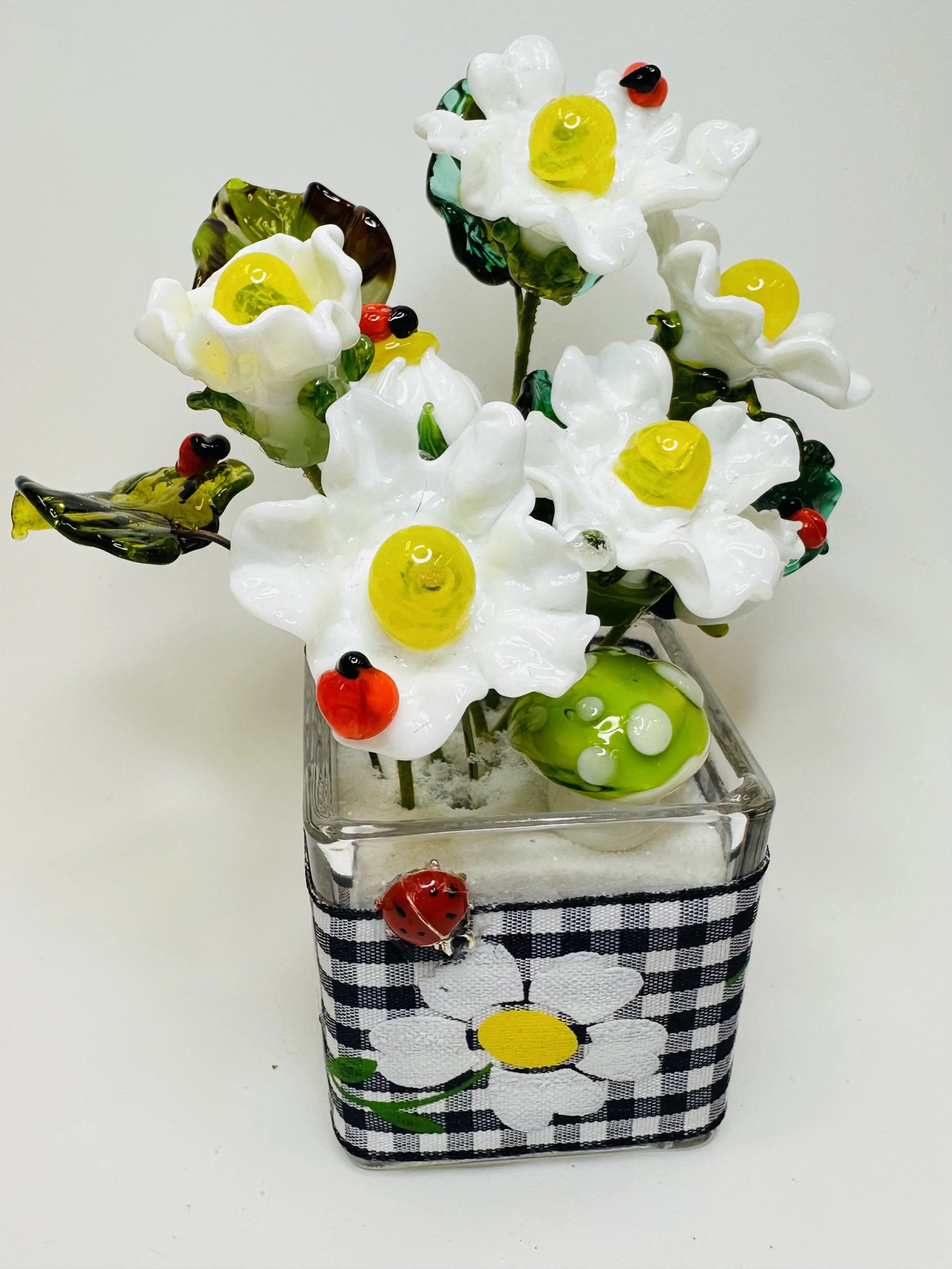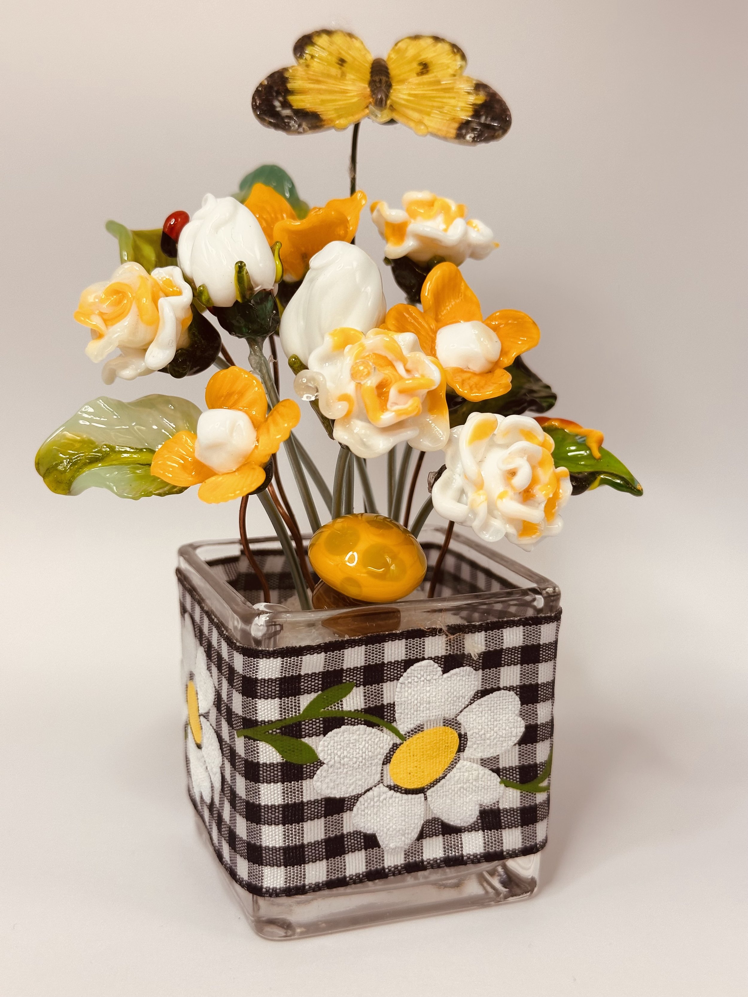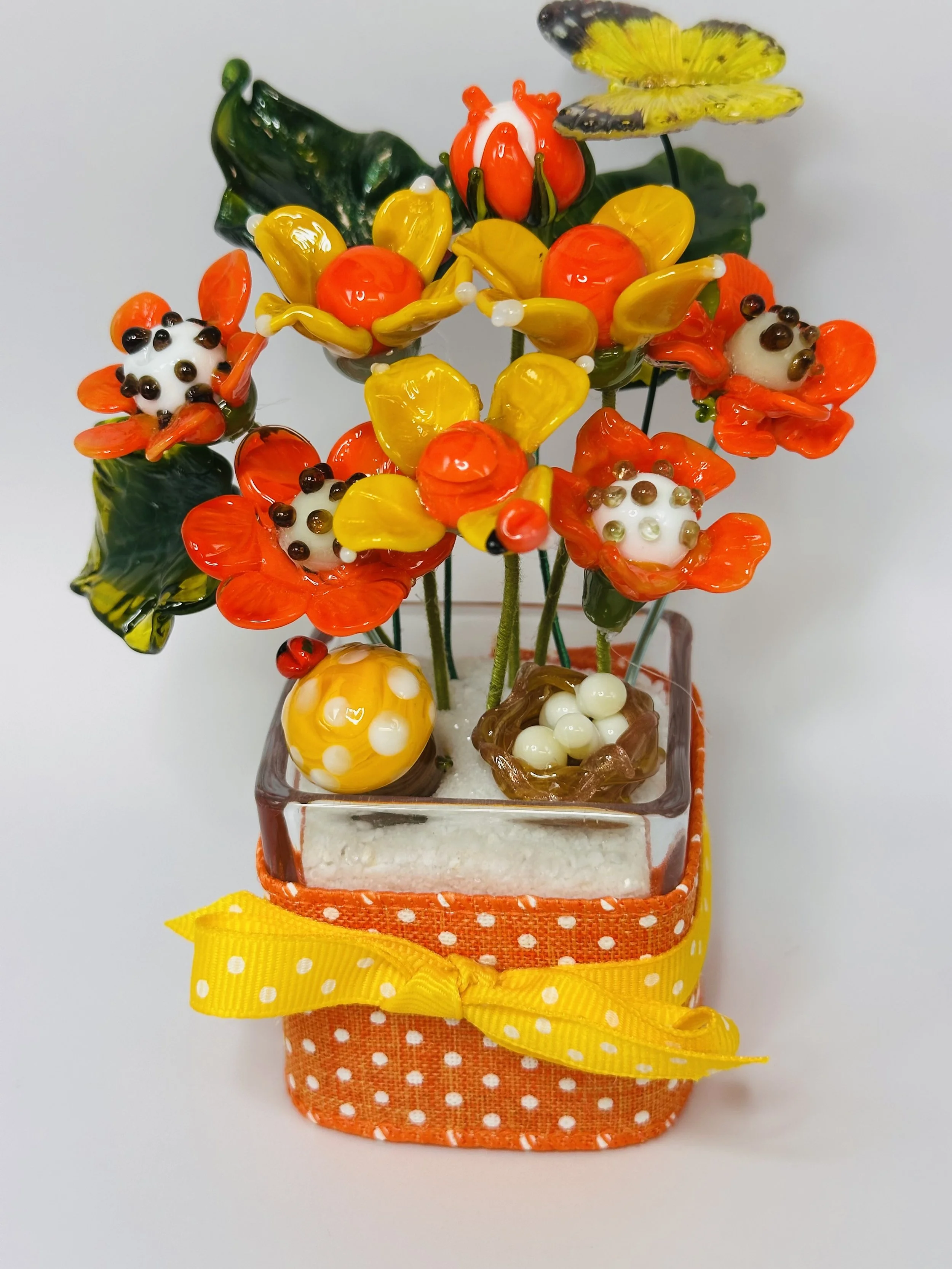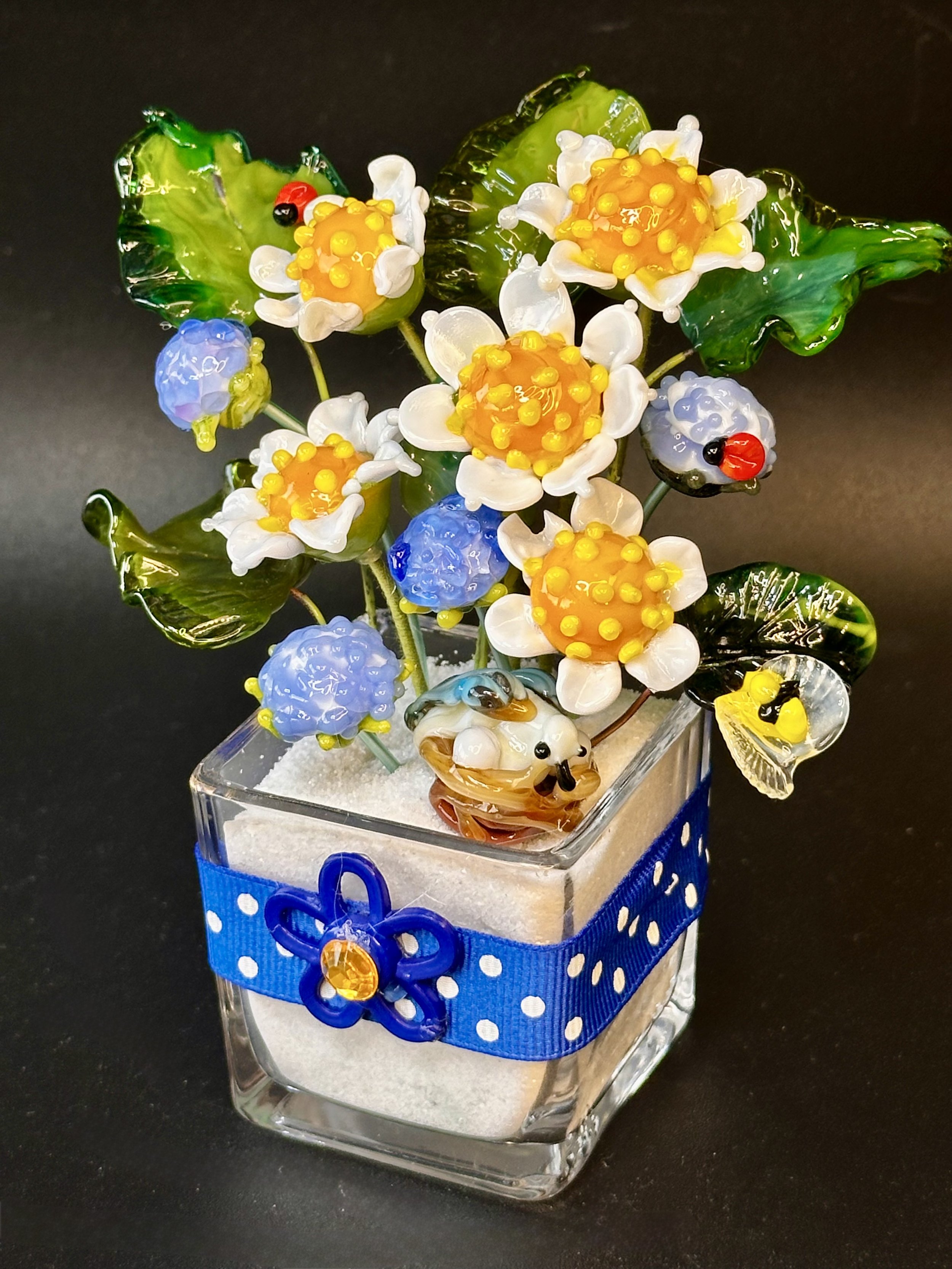 Lampwork flower arrangements each handmade on a mandrel with molten glass.