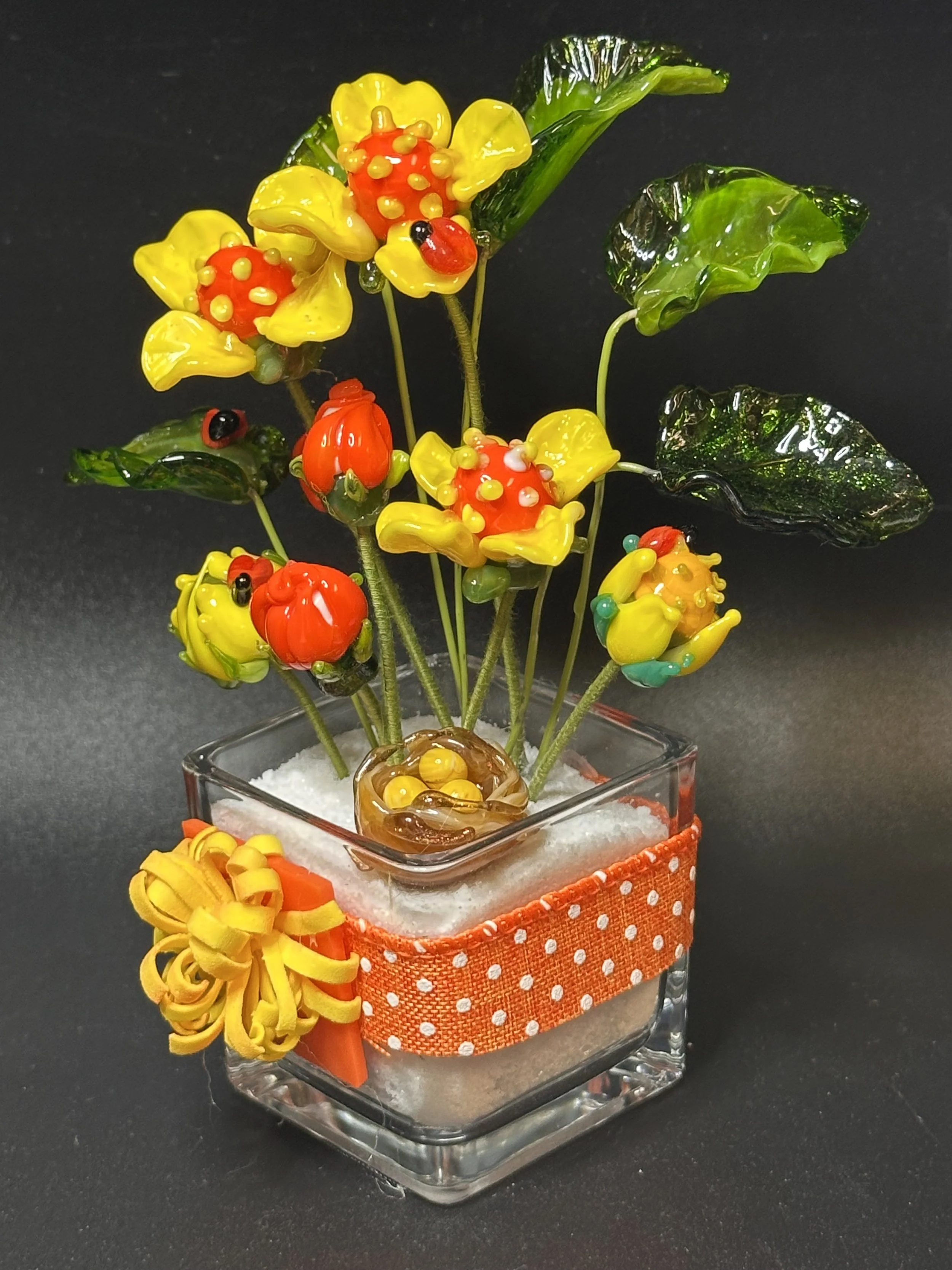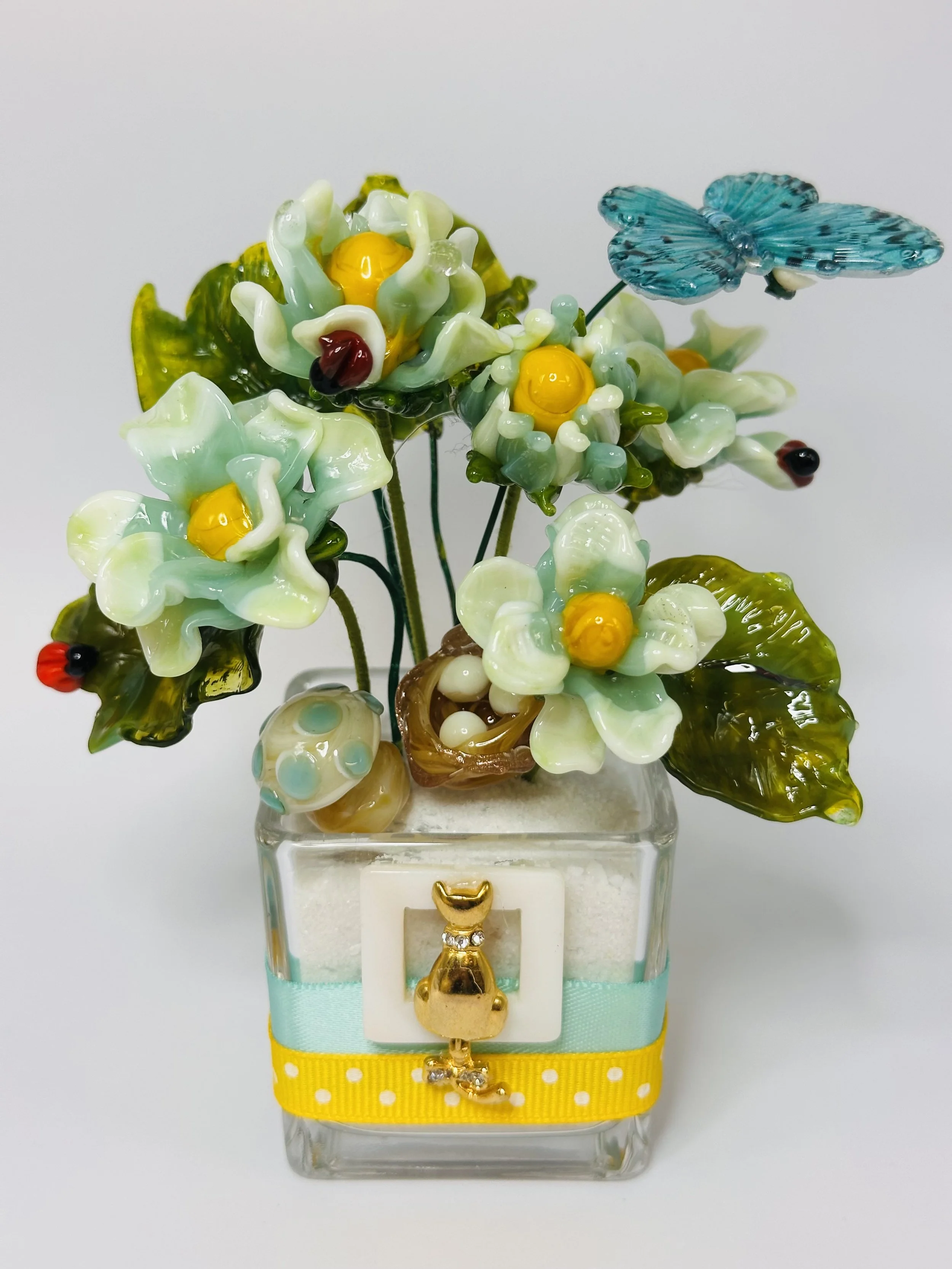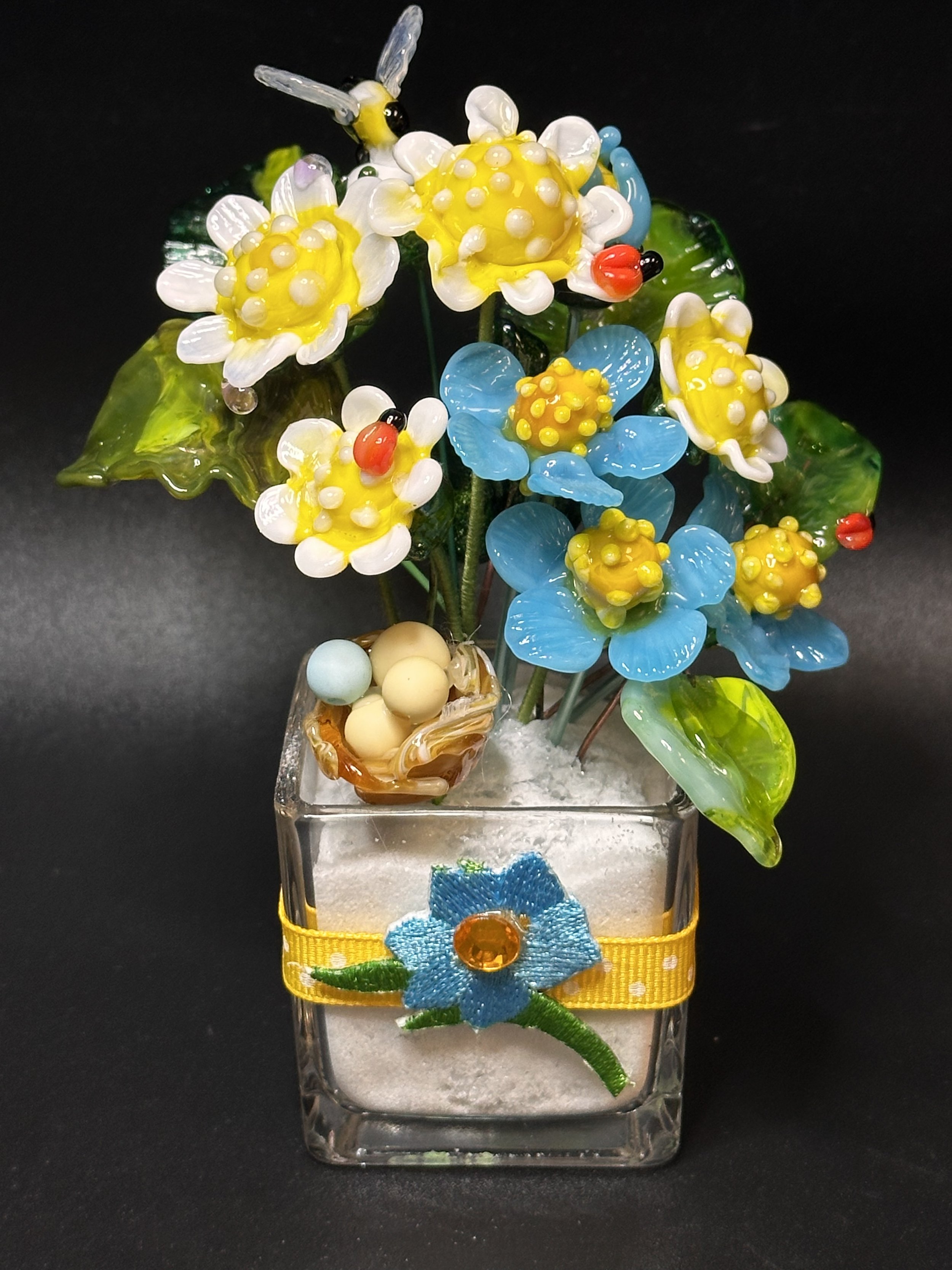Smaller bonsai arrangements in votive vases.. Lampwork sculpture flowers and birds nests with butterflies and bees.