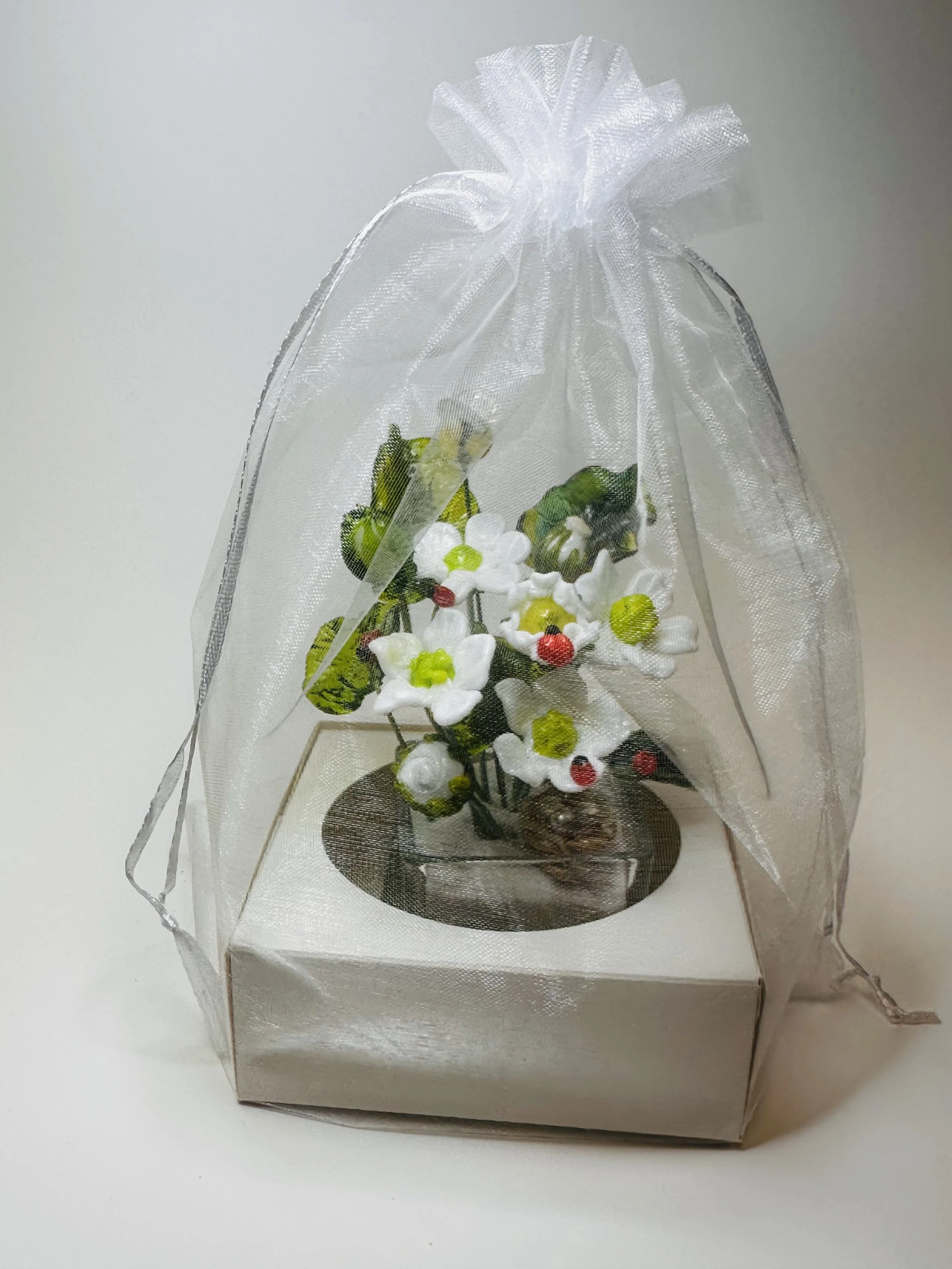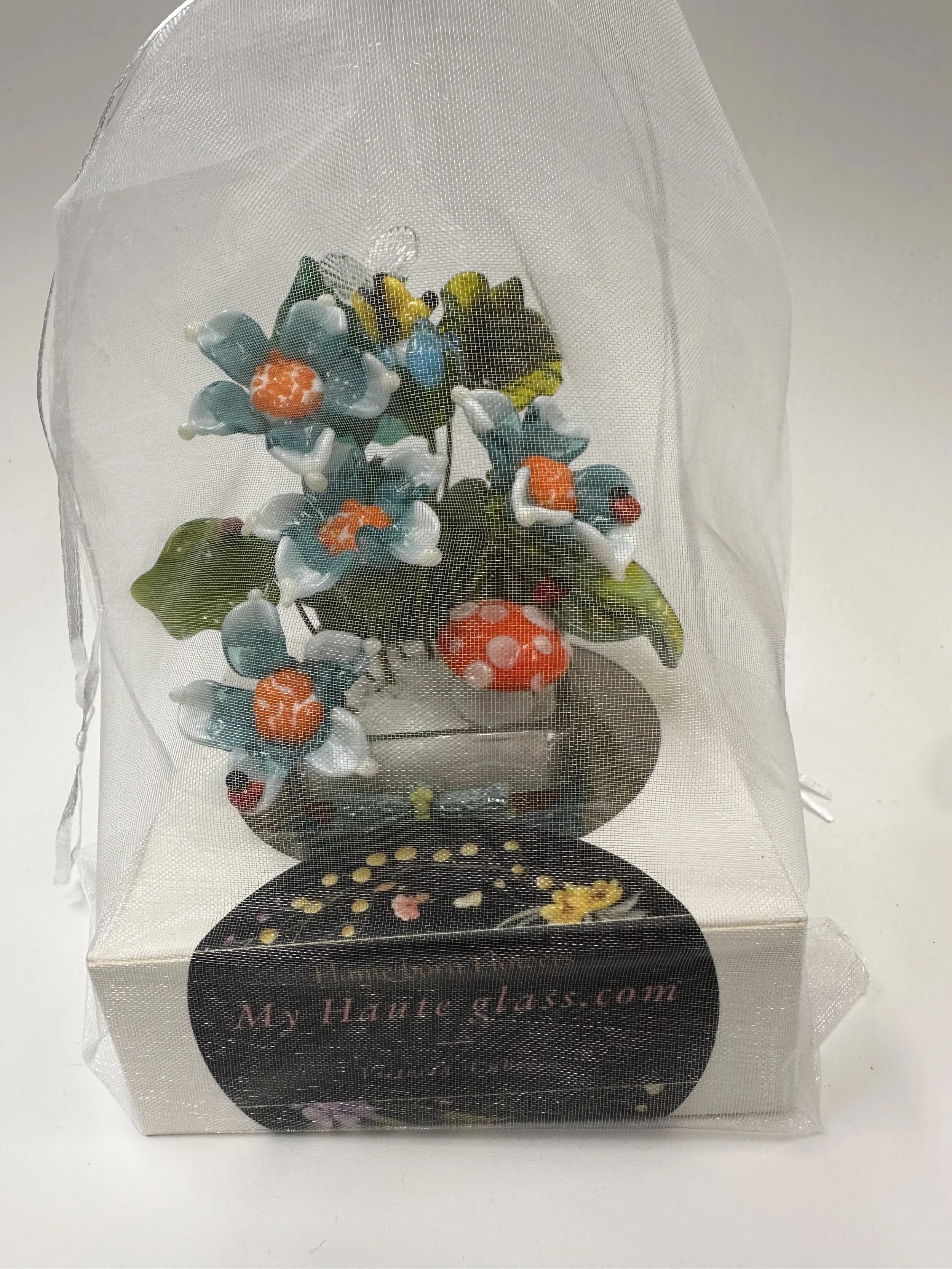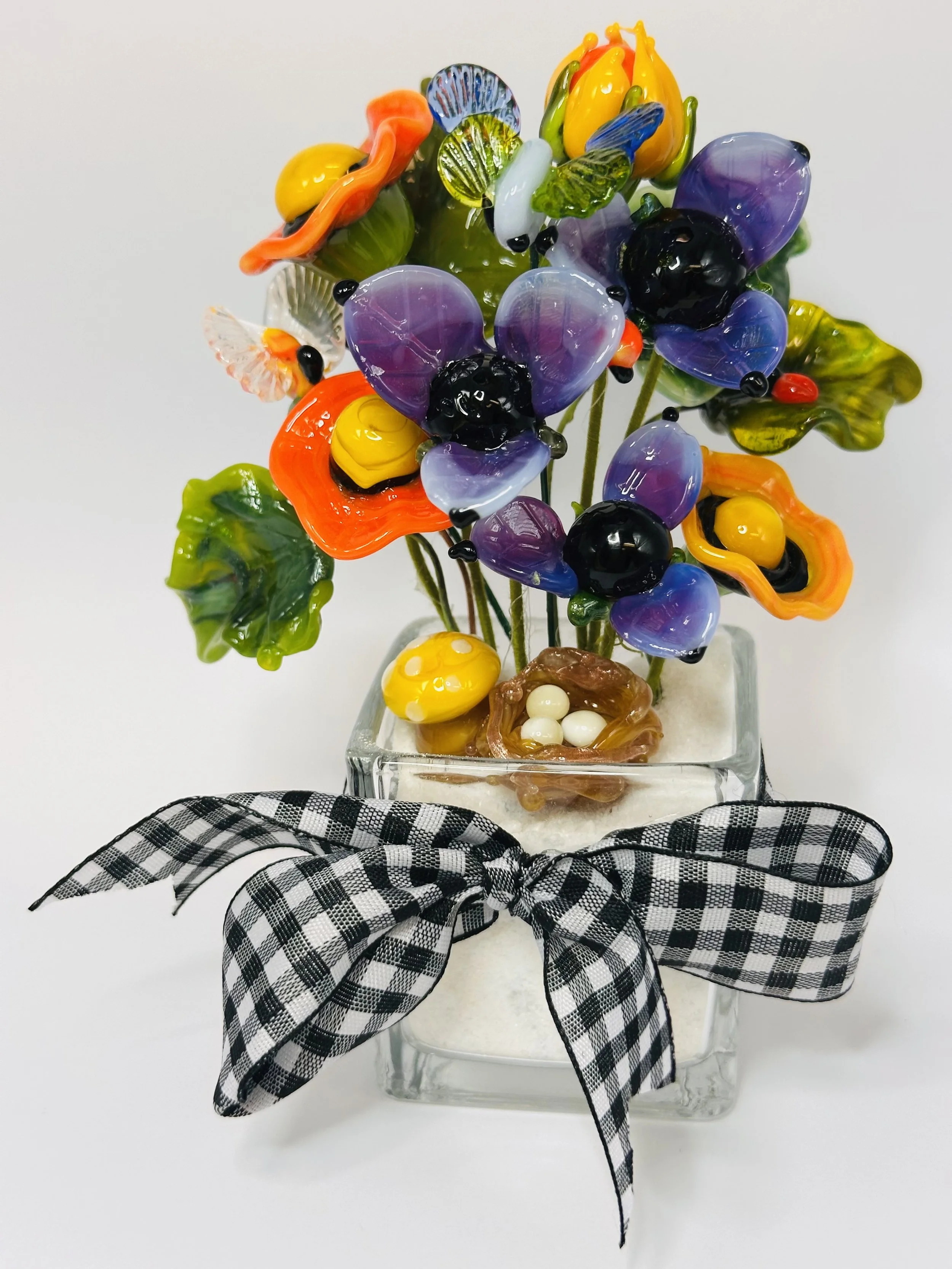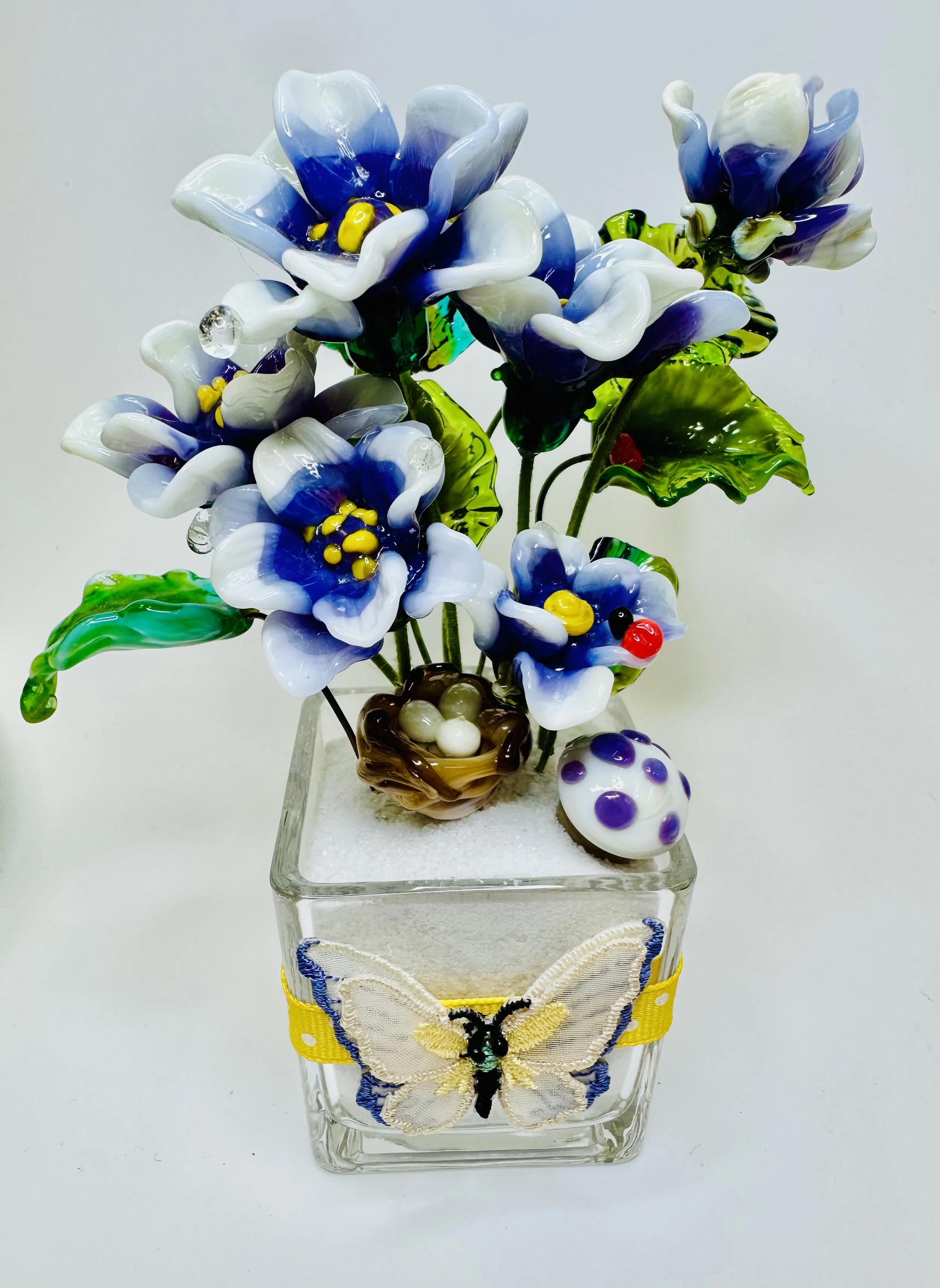 Smaller bonsai arrangements in votive vases.. Lampwork sculpture flowers and birds nests with butterflies and bees.