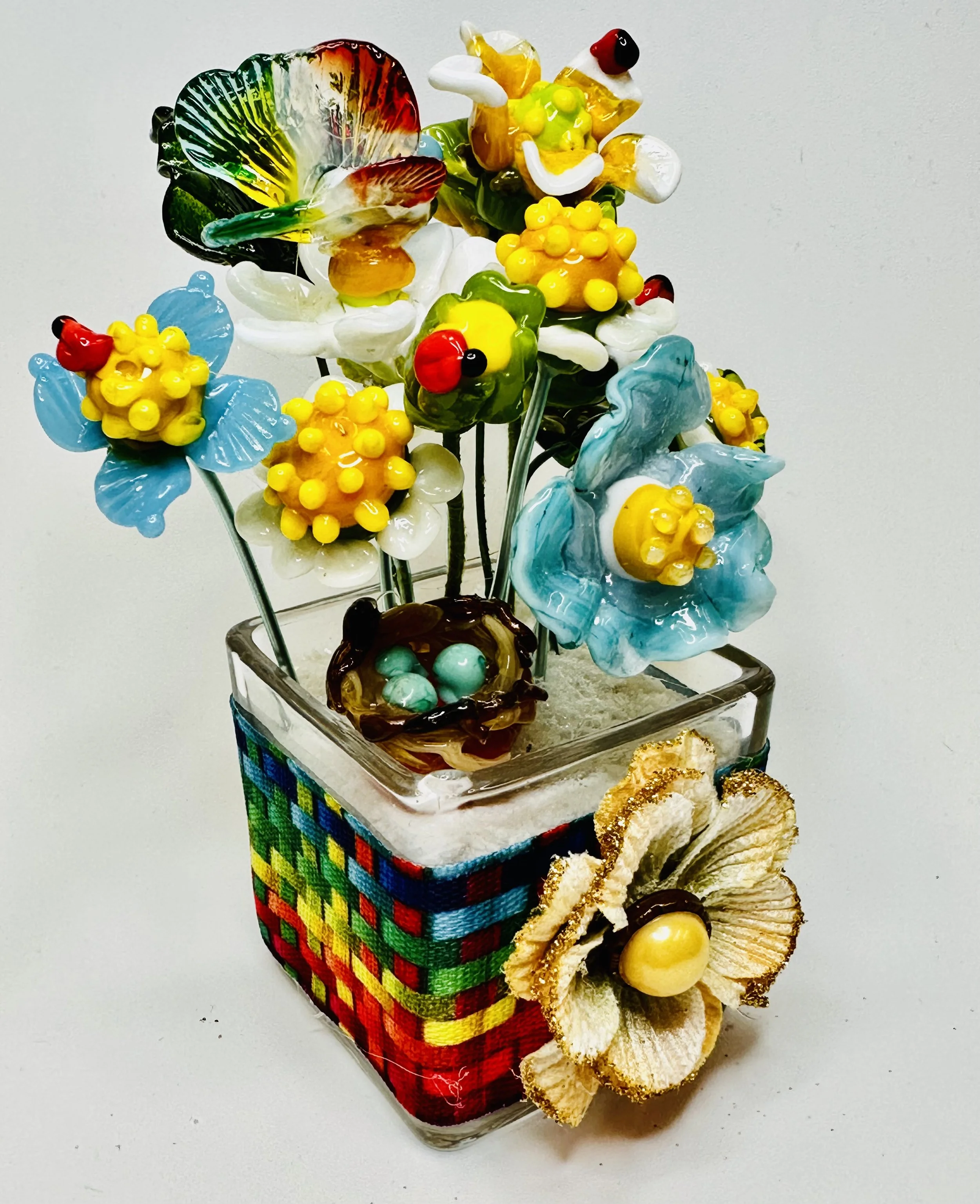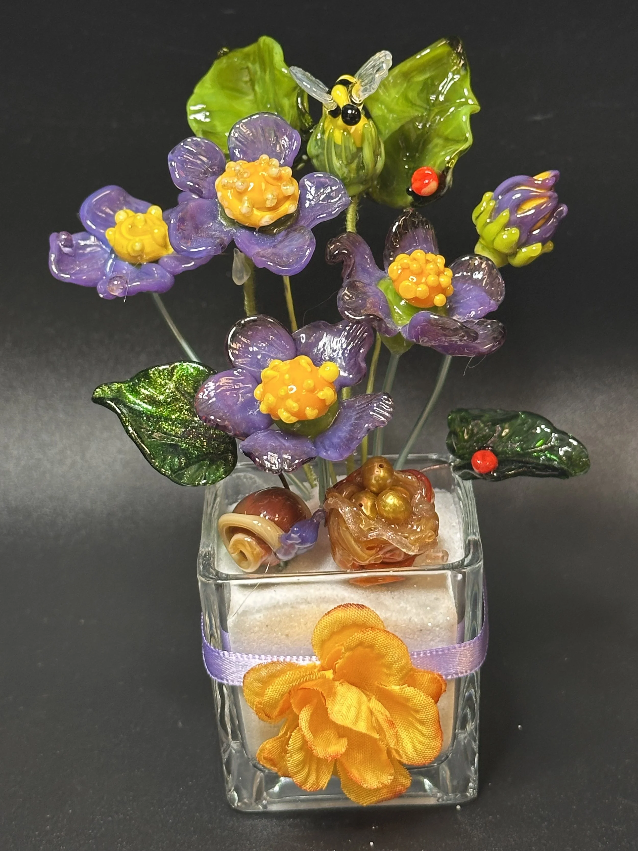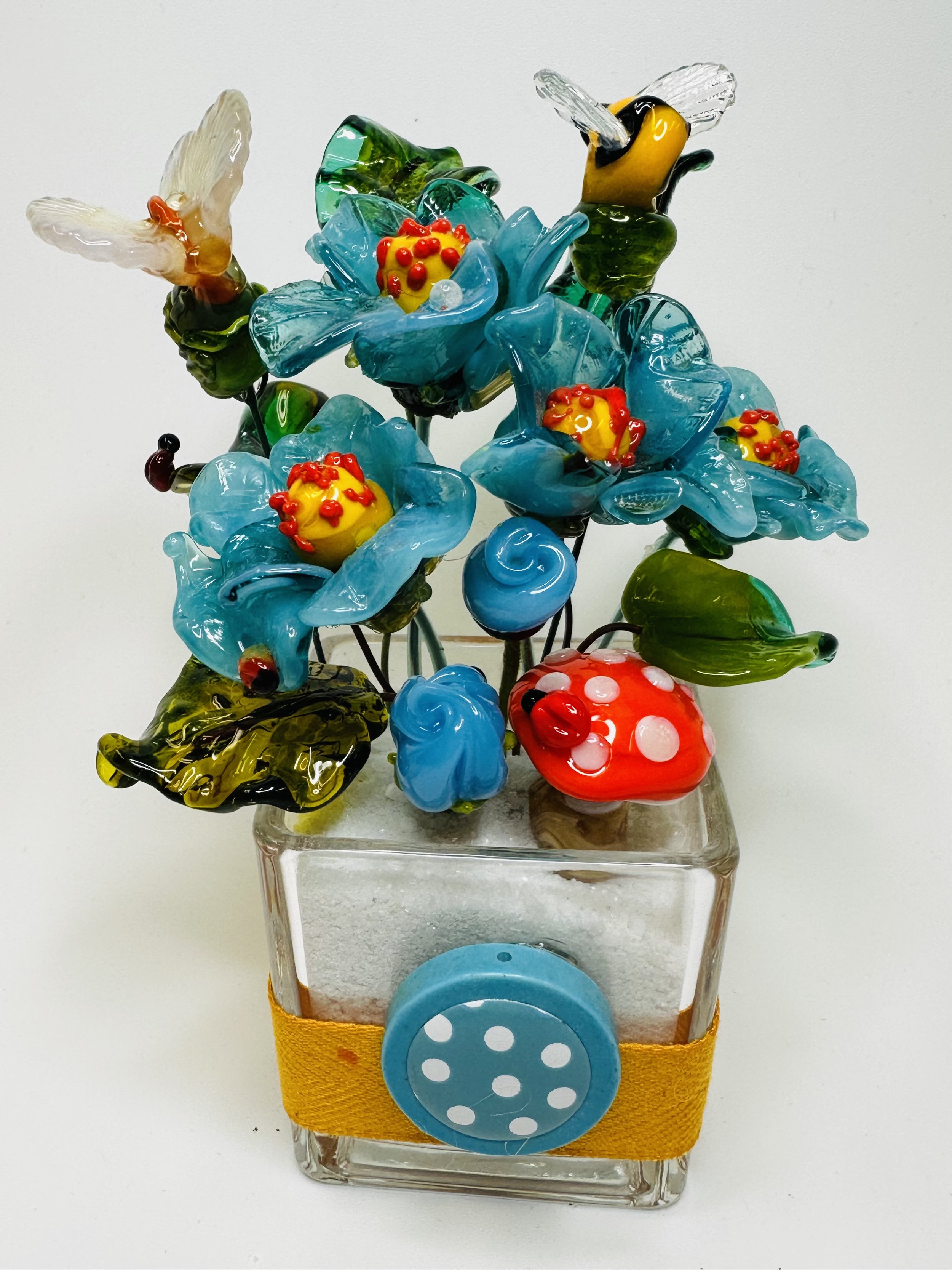 My name is Victoria Cubeiro and I live in Newport Beach. My passion is lamp working with a torch to make glass sculpture. My flower arrangements are imaginary flowers I have created the technique unique to my work. Enjoy…